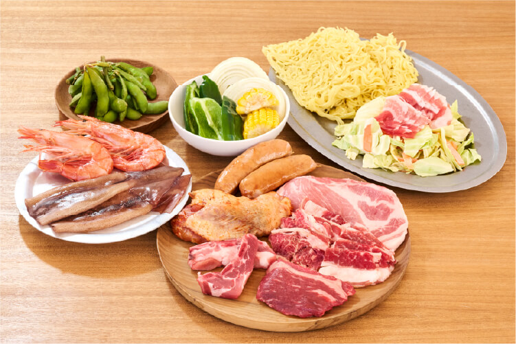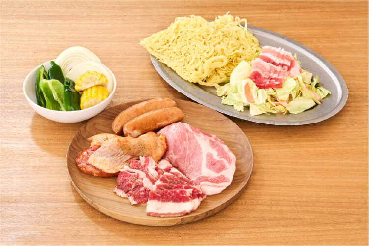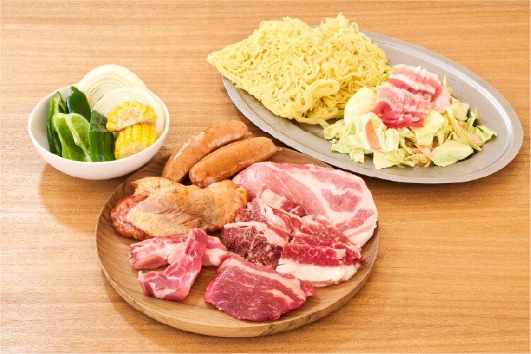 肉5種・あらびきソーセージ・海鮮2種・野菜・焼きそば・枝豆・調味料セット -