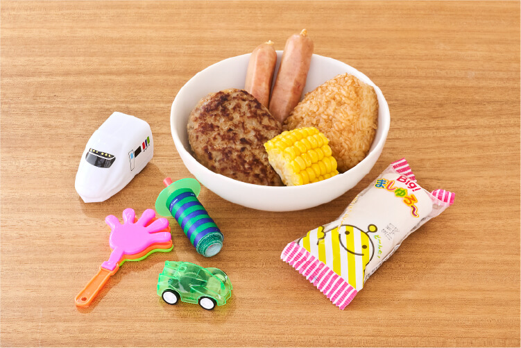 ハンバーグ・ソーセージ・とうもろこし・焼きおにぎり・マシュマロ・おもちゃ(1つお好きな物をお選びいただけます)※キッズプランのみでのご利用はいただけません。