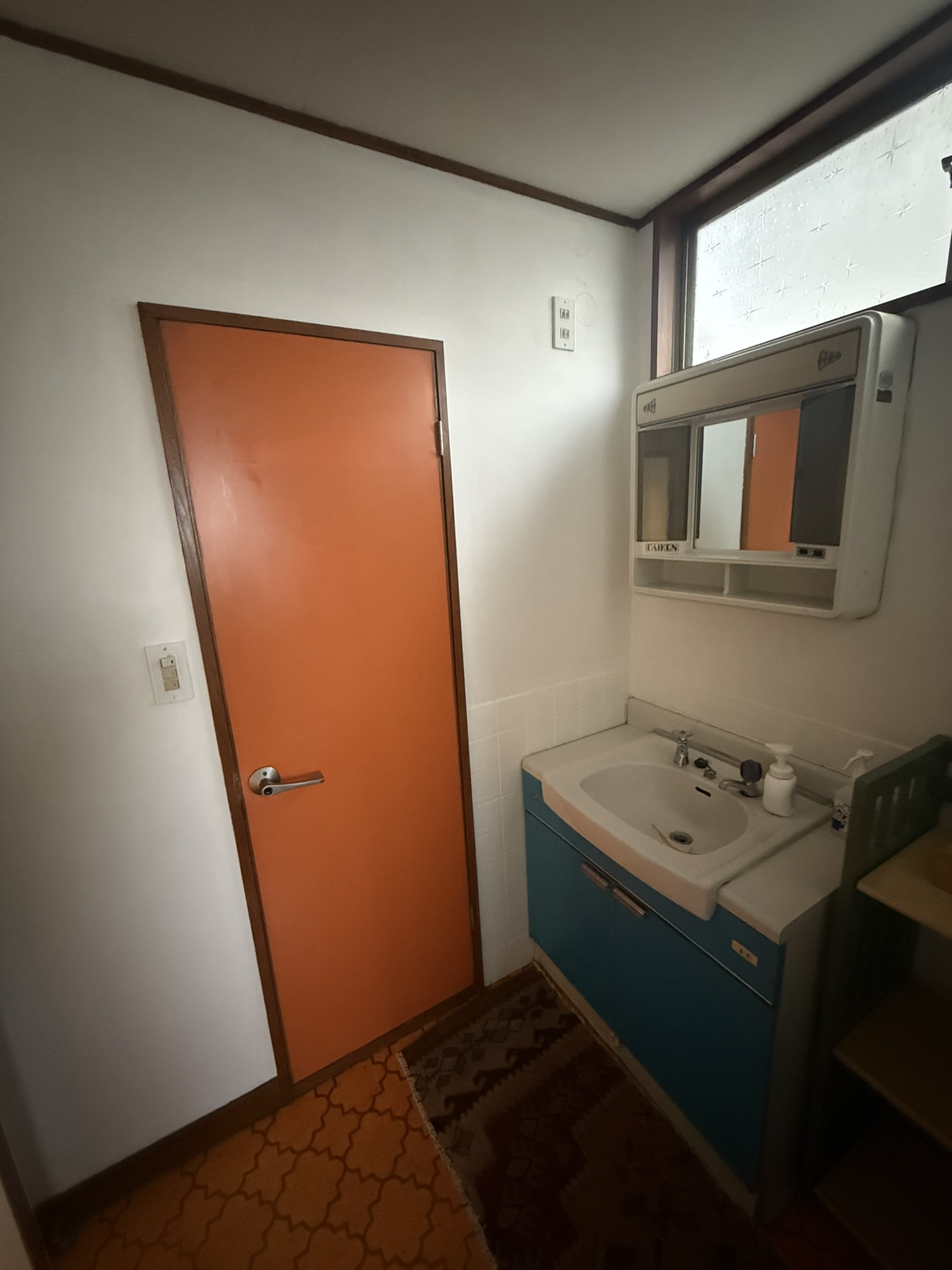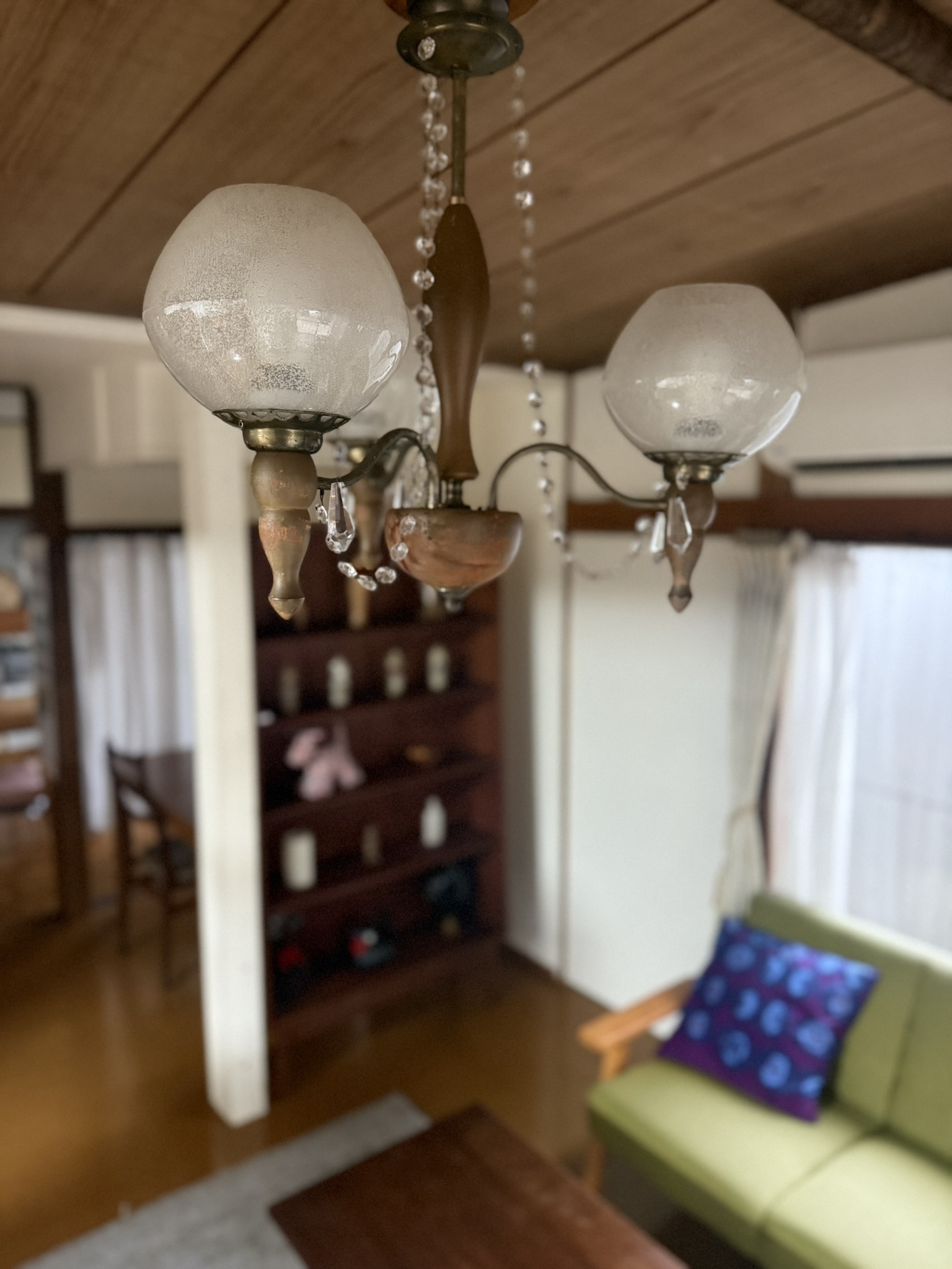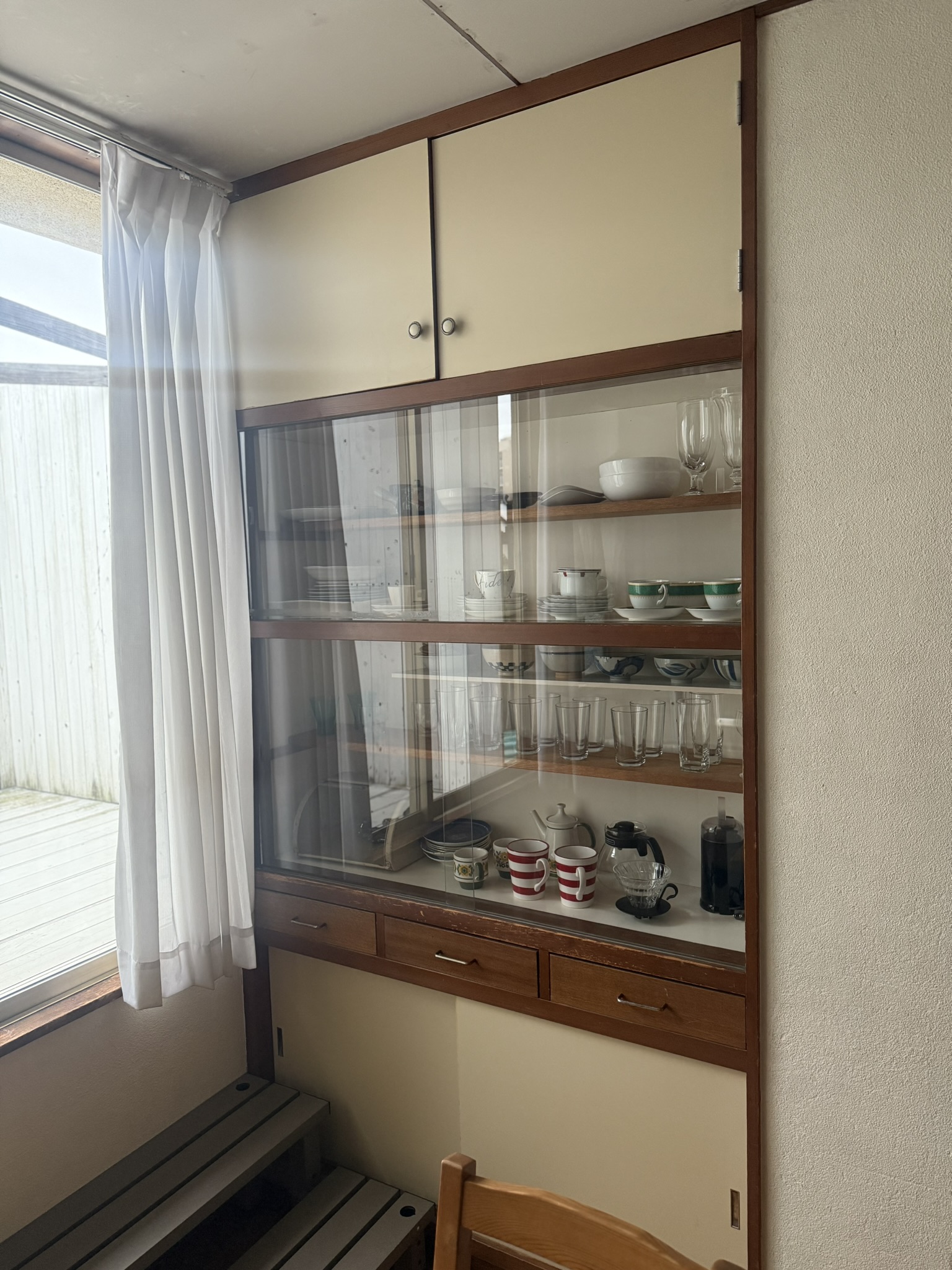 硝子扉の食器棚にレトロな配色。
