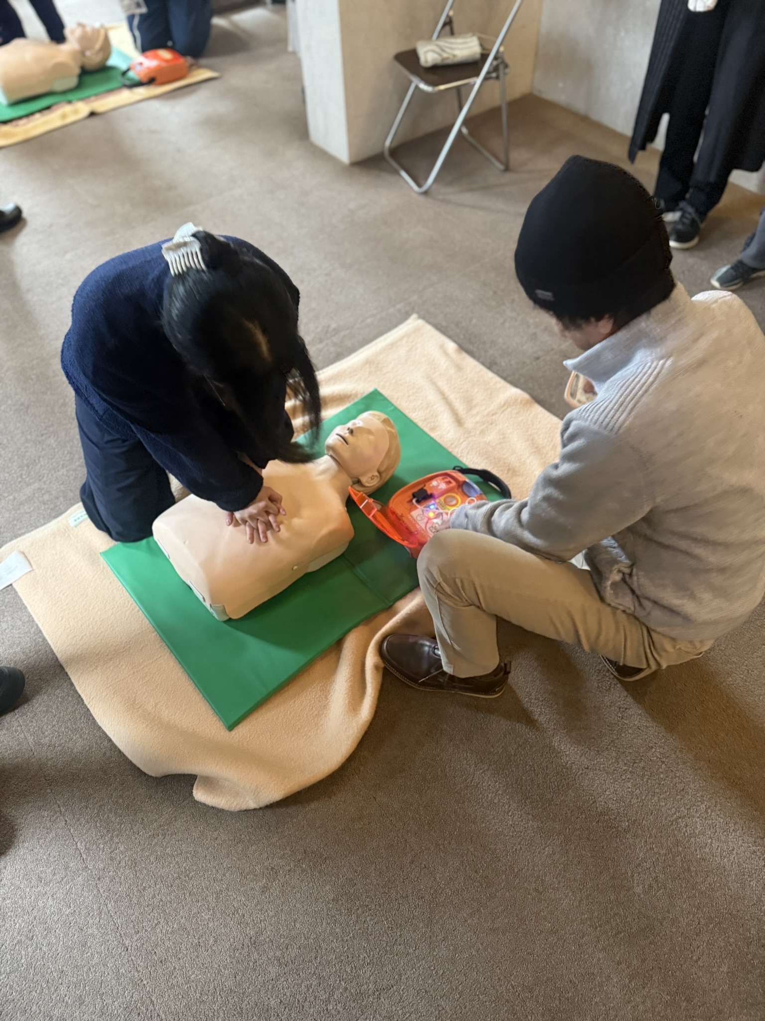 訓練用のマネキンに実際心臓マッサージをやってみるんですが