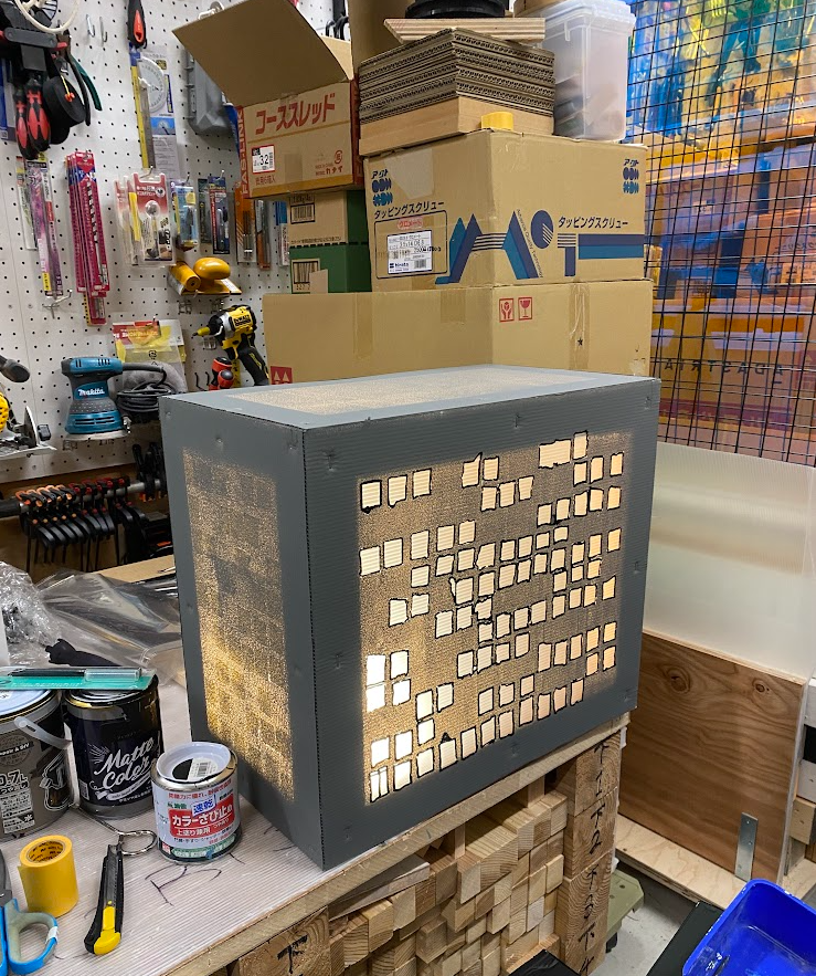 角材フレームに「プラ段」を張り、