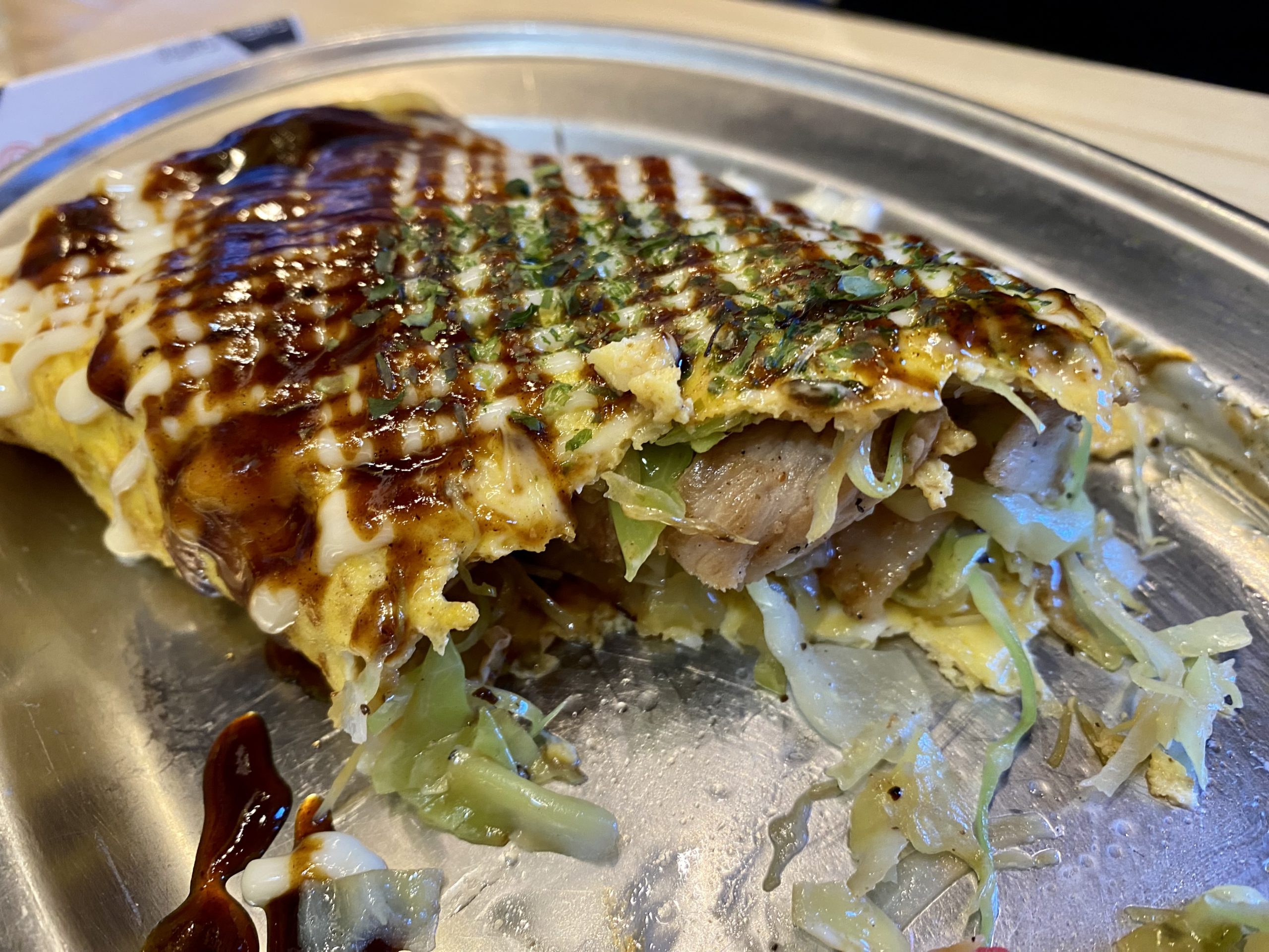 →大変美しい、とんぺい焼き。かなりボリュームがあり、キャベツはもちろん豚肉もたっぷり入っていて食べ応えがあります。焼きそばと甲乙付け難い逸品。