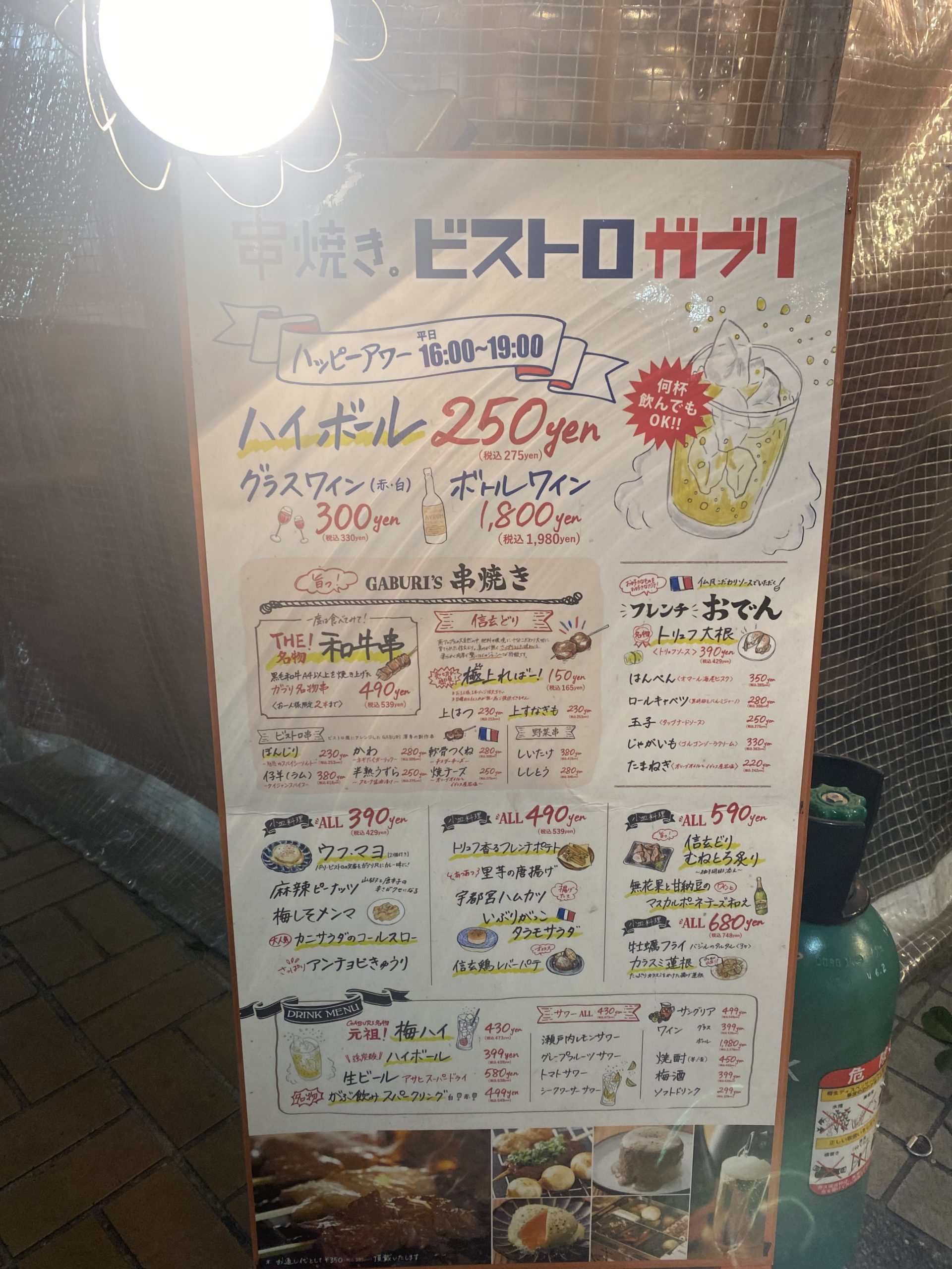串焼きはもちろん、おでんや、フレンチテイストのツマミで気軽に飲れる「串焼き。ビストロガブリ」さん。メニューに独自性があり平日19時までハッピーアワーを開催しているので、ハシゴ酒に重宝間違いなしのお店です。