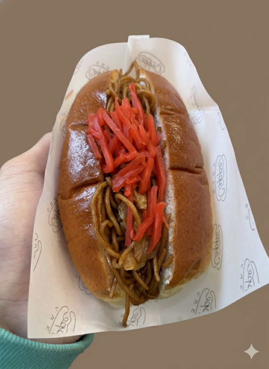 →王道の焼きそばパン。紅生姜のアクセントが効いていて、懐かしさと安心感のある一品です。