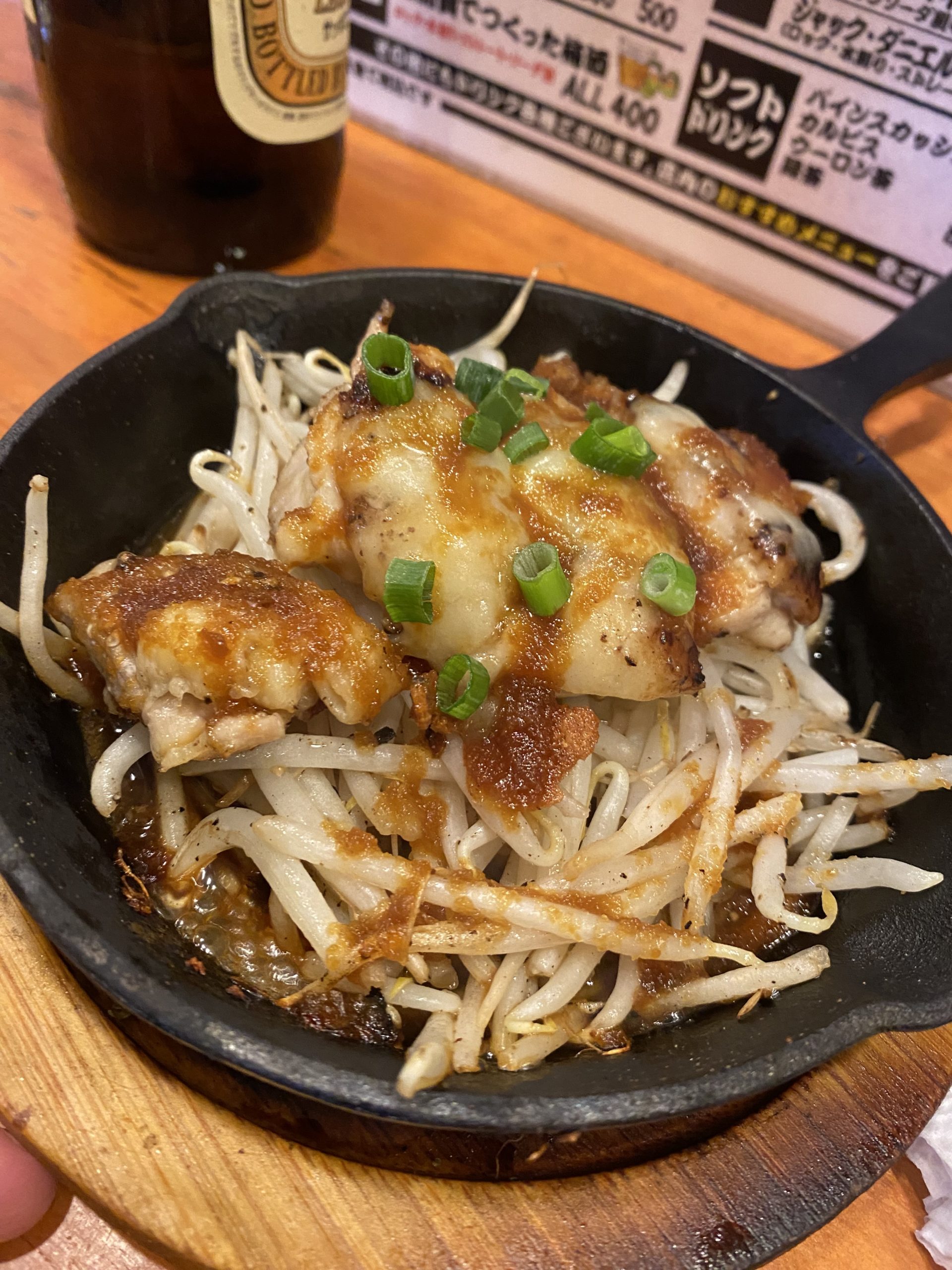 →鉄板焼きの定番メニュー。味付けのベースは山盛りもやしに近いですが、香ばしく焼かれたチキンが乗ってるので贅沢な逸品。ファーストオーダーは、もやしかこちらのチキンステーキで迷います。