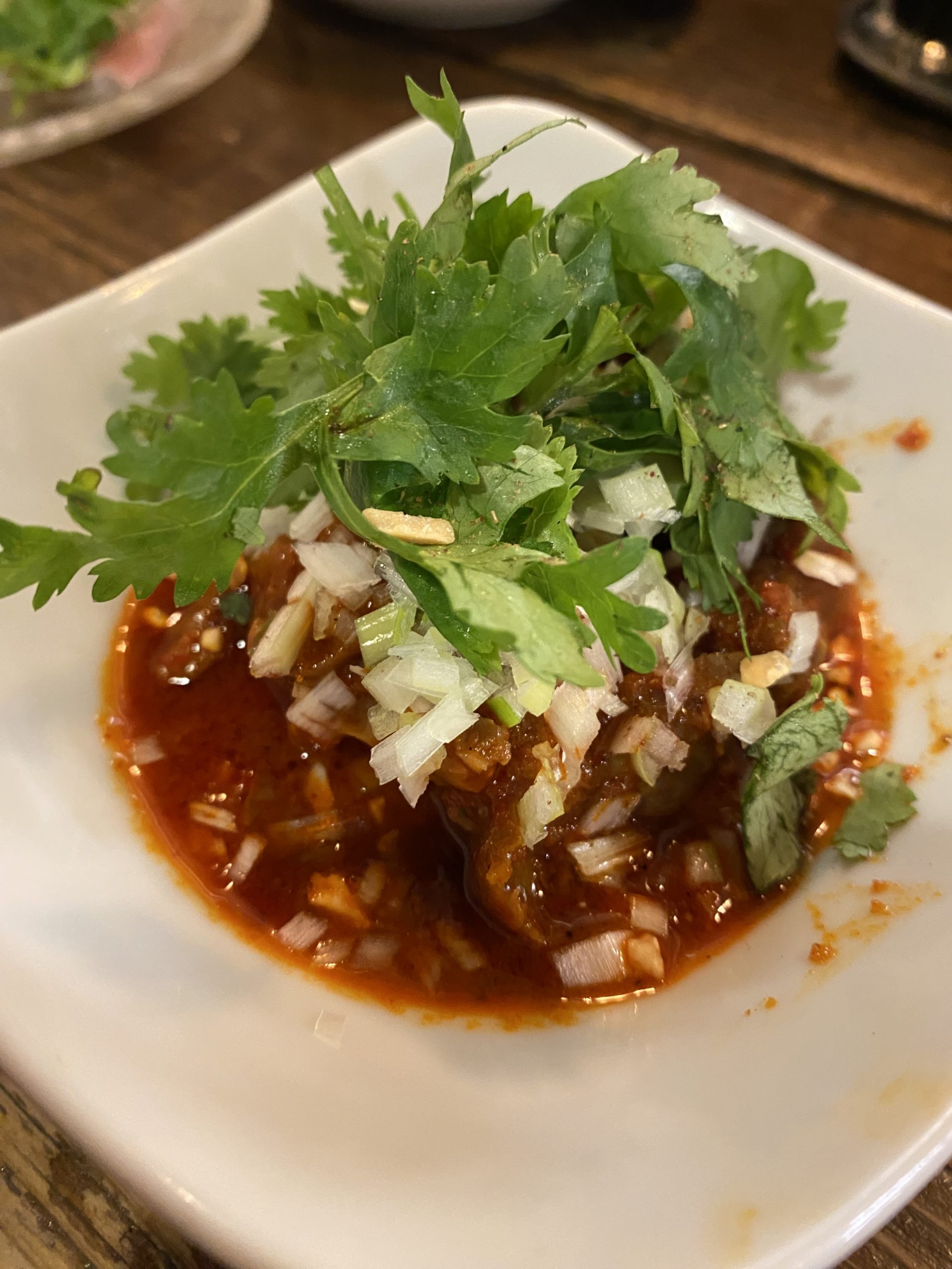 →立ち飲み席限定メニュー。暖かいモツ煮×チャンジャといった感じでチビチビいけるのでツマミに最適です。