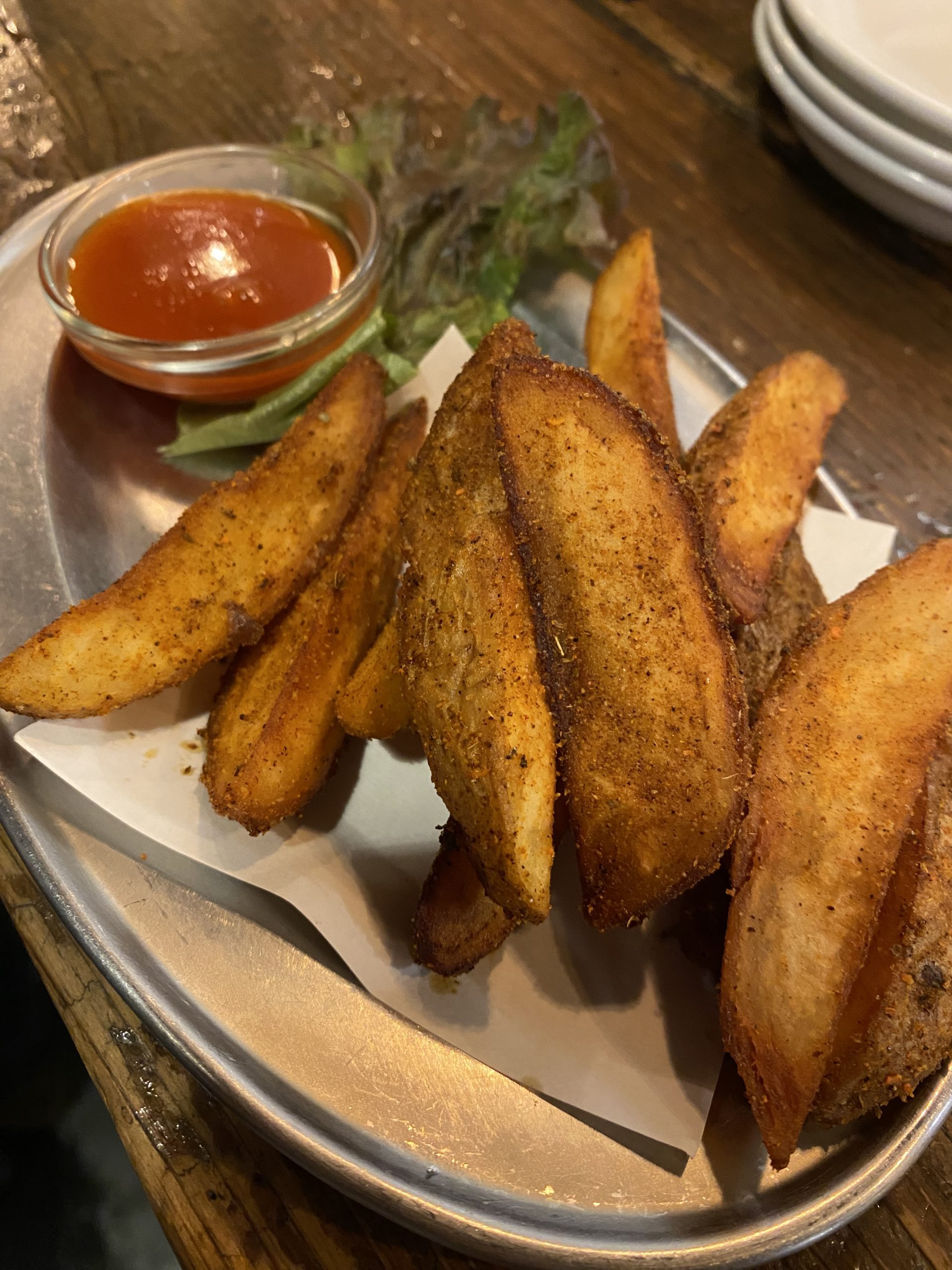 →以前からの定番メニュー。洋風ではなくアジアテイストのスパイシーポテト。程よい辛さで酒が進みます。付属のスパイシーなソースでいただきます。