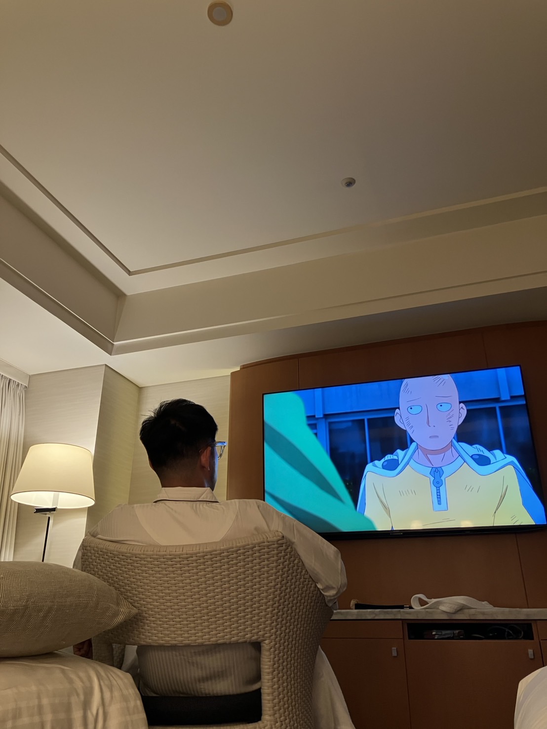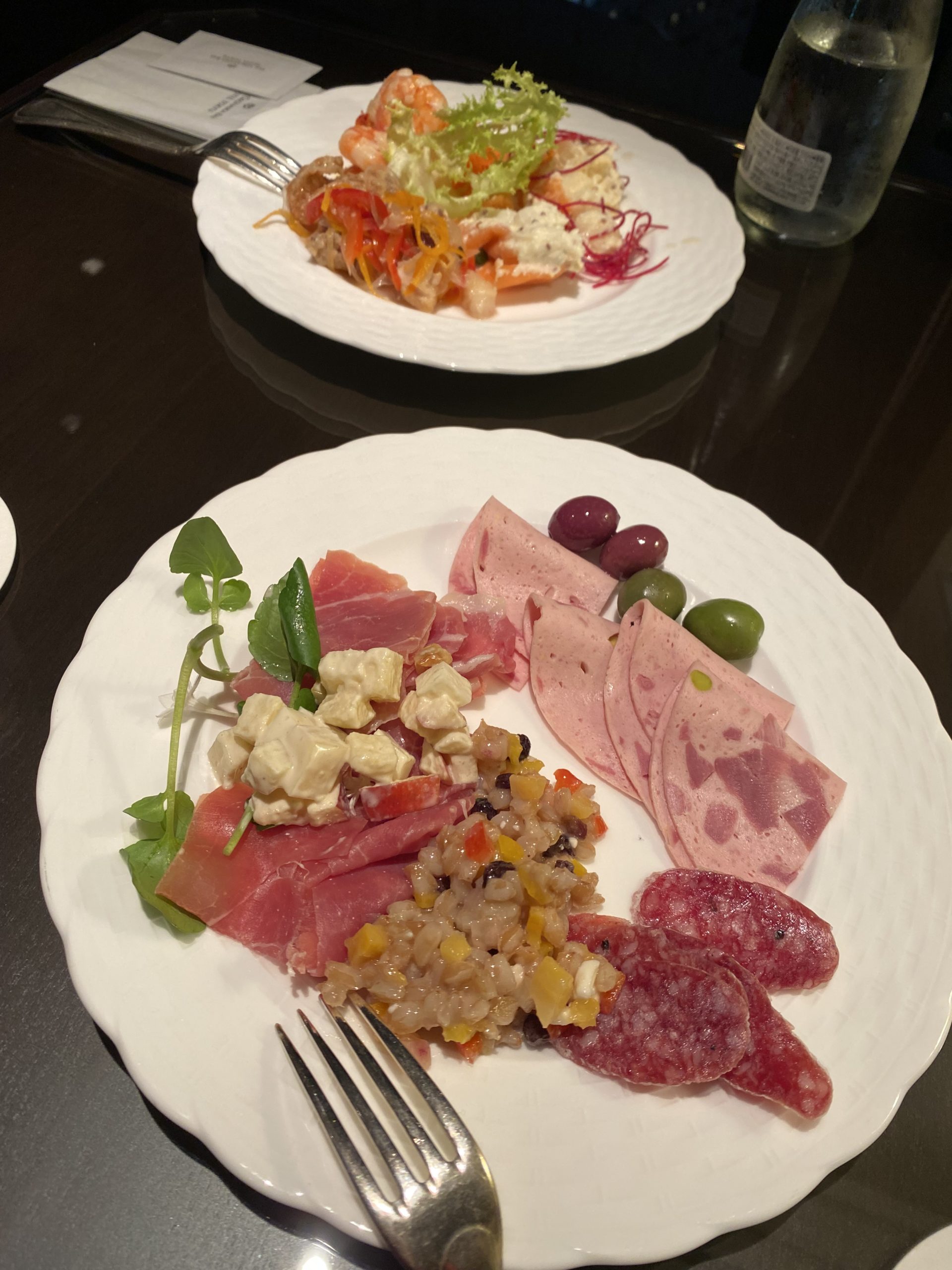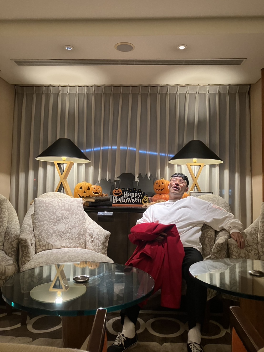 ついつい食べ飲みすぎてエレベーターホールでひと休憩。