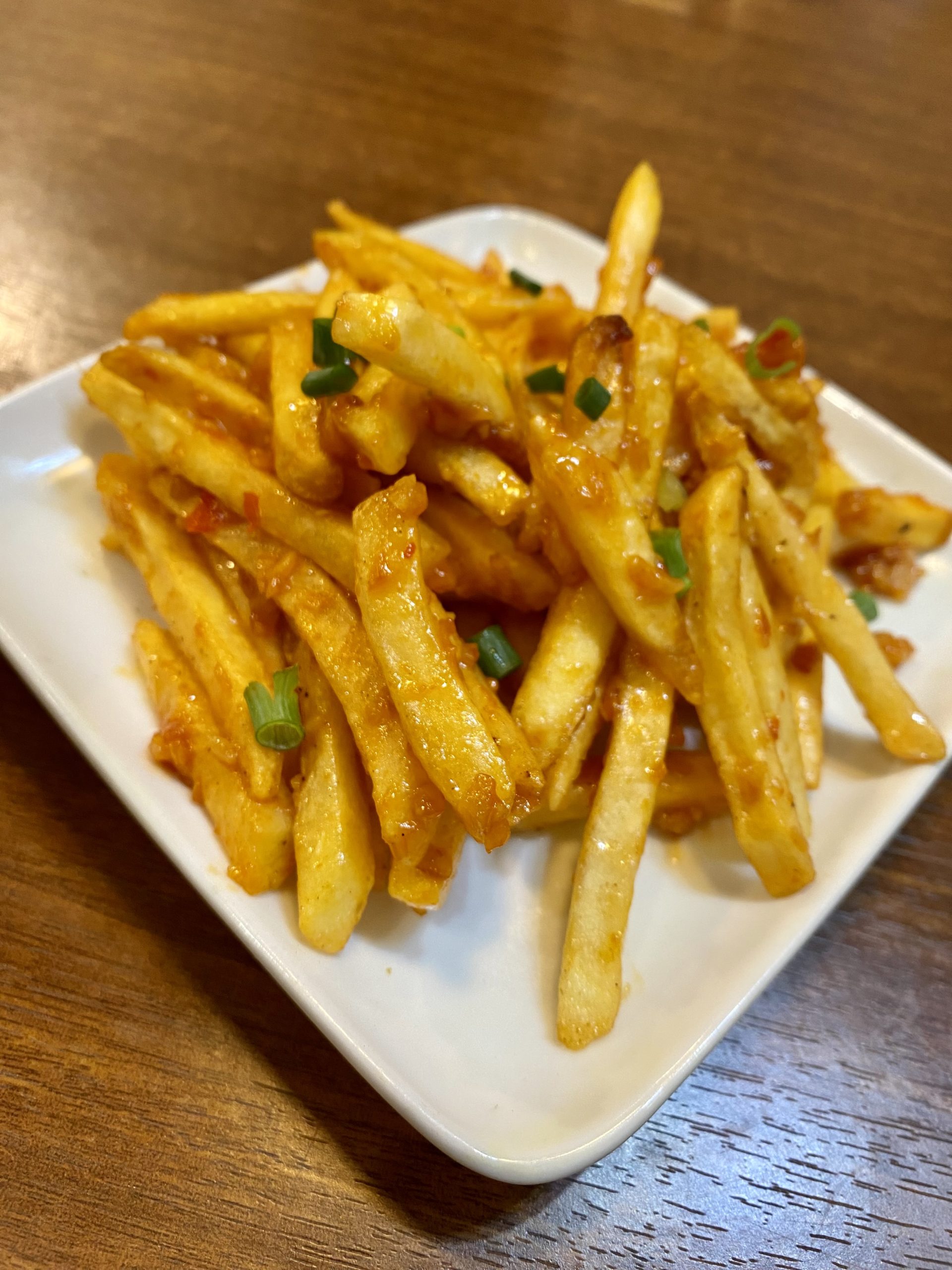 →ニンニクと甘辛の香辛料の効いたタレが絶妙に絡んだ絶品のツマミ。ガーリック味のポテトをアジアンテイストにブラッシュアップして進化した逸品。