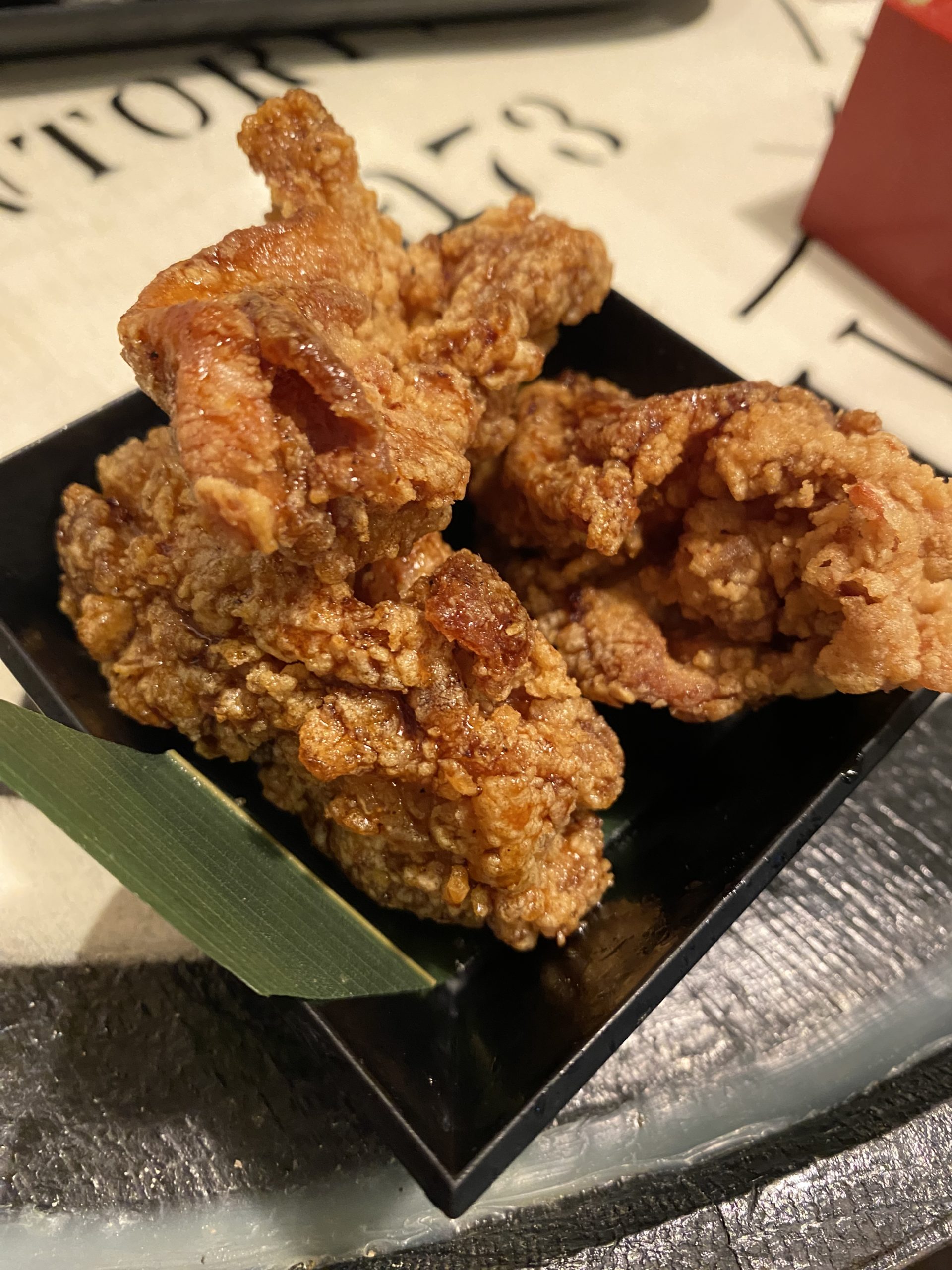 →味が濃い目で胡椒がスパイシー、衣サクサク、ジューシーだけどもたれない感じの唐揚げです。