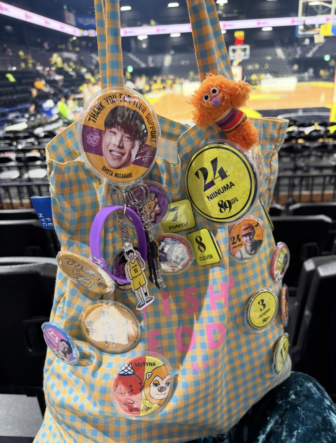 今年の推し方バッグは、FISHS EDDYのトートにひたすらバッジ付けてます😂