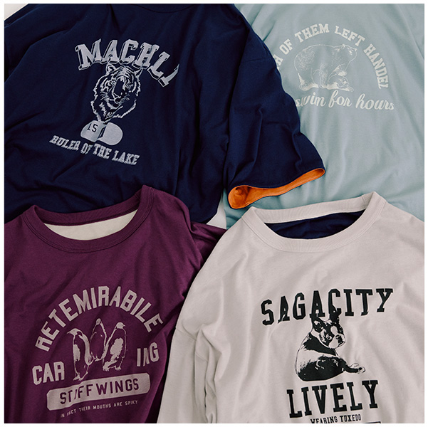 表面はトレンドのアニマルモチーフのカレッジデザイン、裏側は胸元に配色を効かせたワンポイントのロゴデザインを採用しました。首元のリブは表裏で共地なので、裏返すとリンガーTのような見え方に変化します。アニマルモチーフやリバーシブルなど、お客様からご好評の要素をふんだんに盛り込んだ贅沢な1着に仕上げました!個人的には、ベーシックなアメカジスタイルのハズシ要素として使うのがおすすめです。