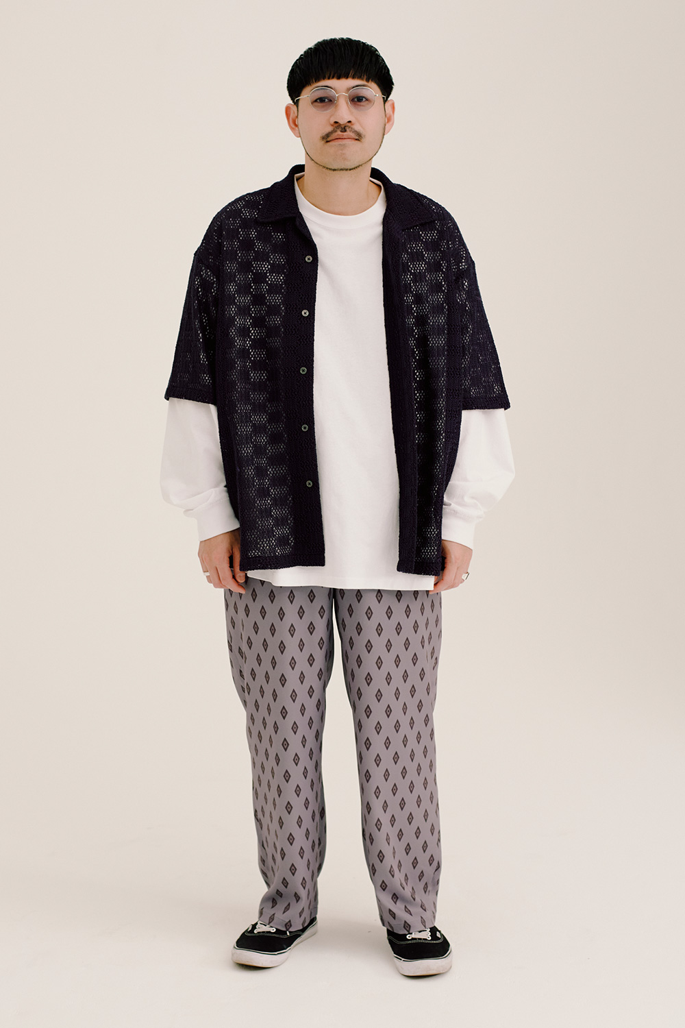 トレンドの透け感要素をニコアンドらしい「こなし」という視点でオリジナルの編立を行い、生まれた商品です。多色で編んだ何色とも言い難い絶妙な配色や凹凸感のある生地が特徴です。風通しや肌離れが良く、夏場も快適に着用いただけます。シルエットはほど良くワイド。さらっと羽織れば抜け感のあるリラックスした印象で着ていただけます。透け感を活かして色のあるTシャツとのレイヤードしてみてください。