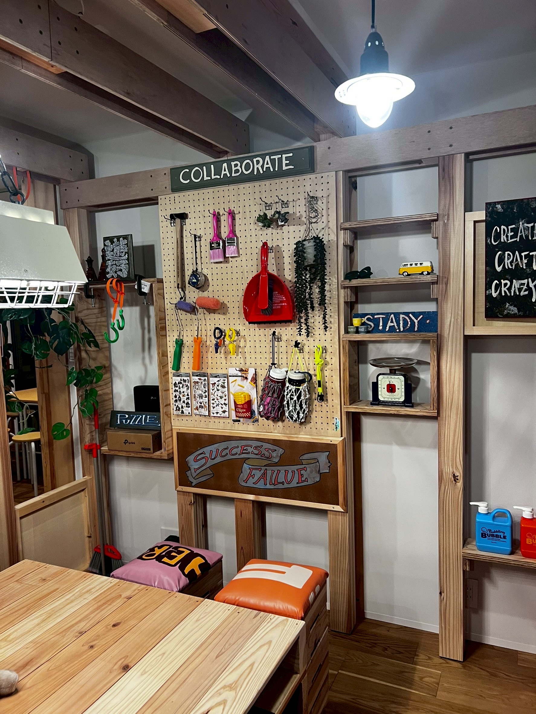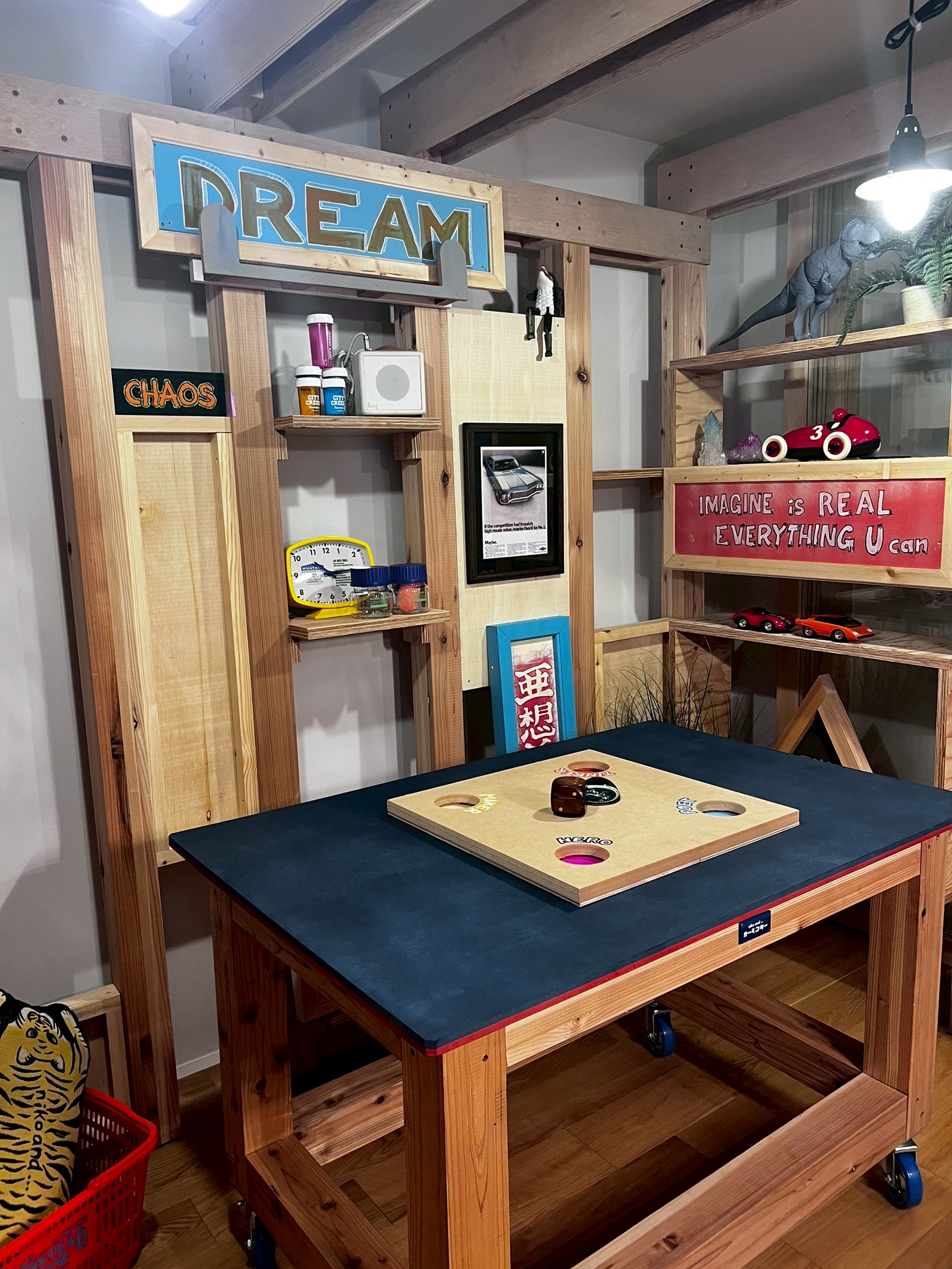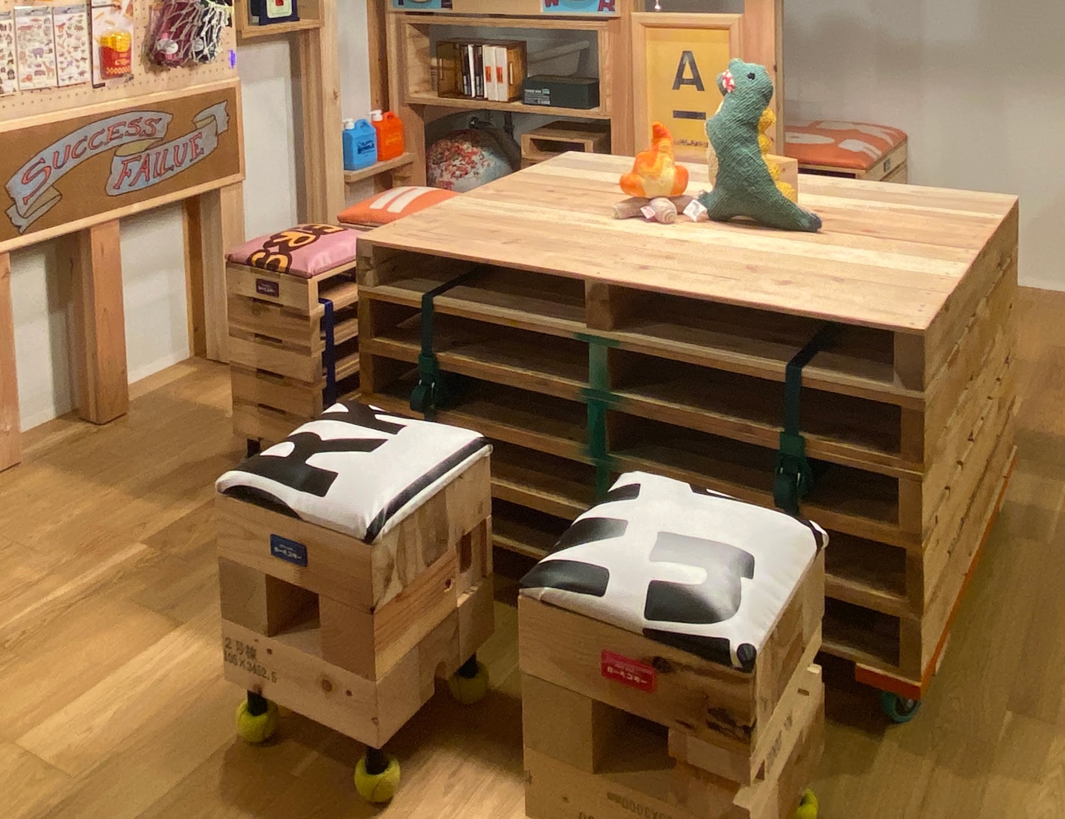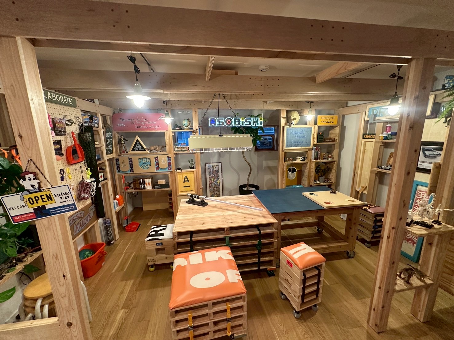 子供向けワークショップを企画・運営する「ASOBISKI」のイメージに合わせて、壁面は「niko and ... カーペンター」が得意とするクラフト感を表現。