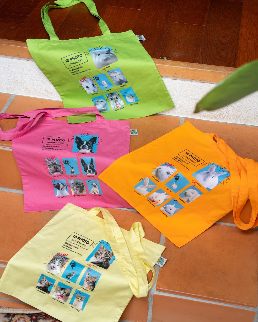 “証明写真のガイドライン”をテーマに、犬・猫・ハムスター・うさぎのユニークな表情を並べたカラフルなトートバッグです。“近すぎ”、“寝てる”といったNG例を含む愛くるしい写真をIDカード風のポップなデザインに落とし込みました。持つだけで気分が上がる、遊び心満載のアイテムです。