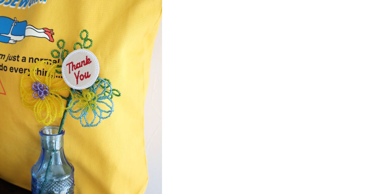 パッケージのまま飾っても花瓶に挿しても可愛いビーズフラワー。Thank youのメッセージはバッジになっているの