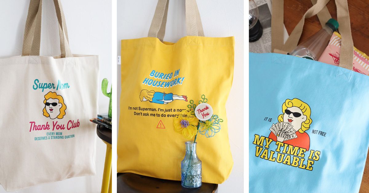 カラフルな色合いにSuper Momのデザインがインパクトのあるトートバッグ。