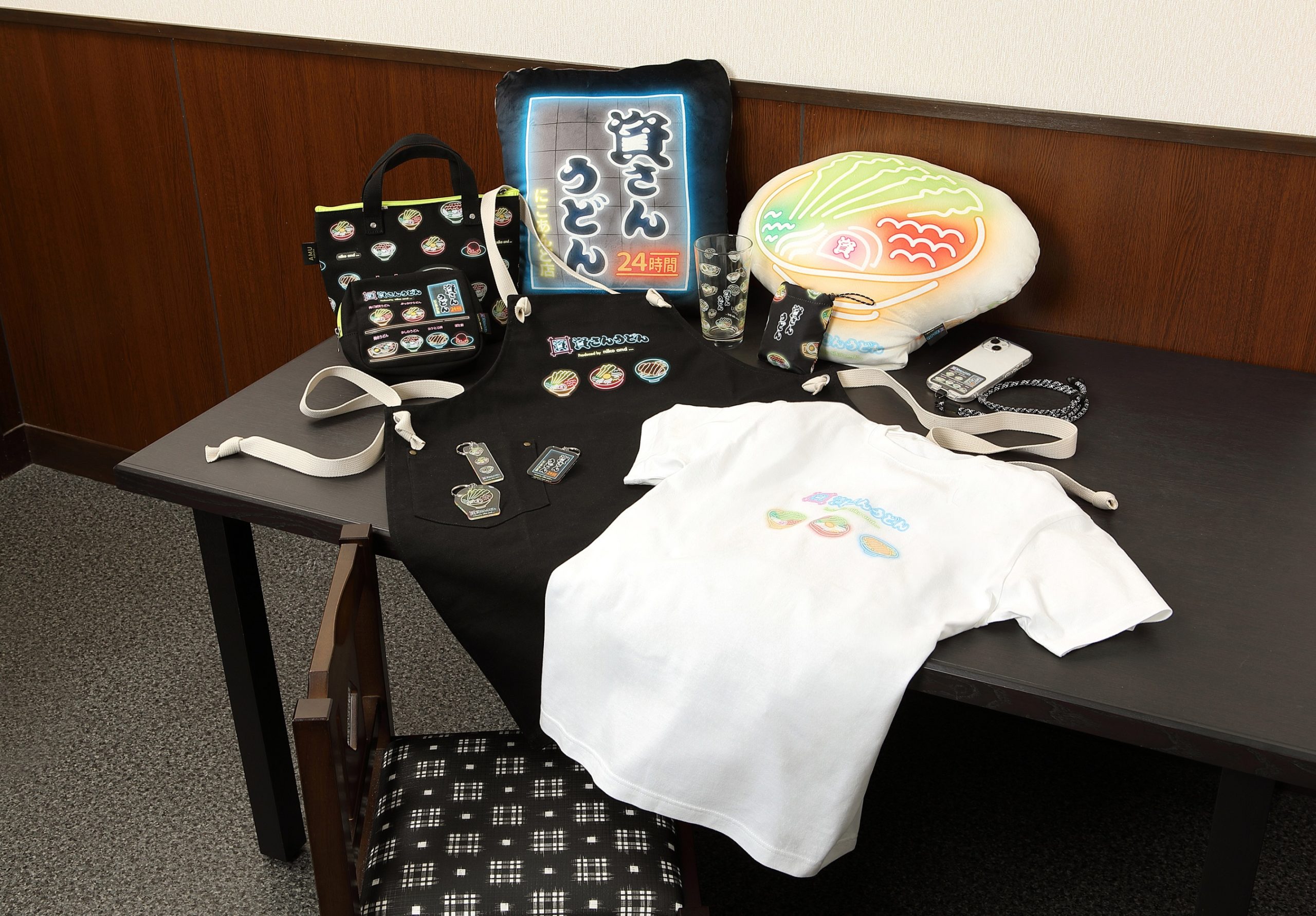 コラボレーションアイテムは、「資さんうどん」の特徴的な“ネオンの看板”をモチーフにデザインしたTシャツやエプロン、人気メニュー“ごぼ天”をデザインに落とし込んだもちもちクッションなど、地元の方はもちろん、誰もがそのユニークさに惹かれ思わず手に取りたくなる全12品番です。