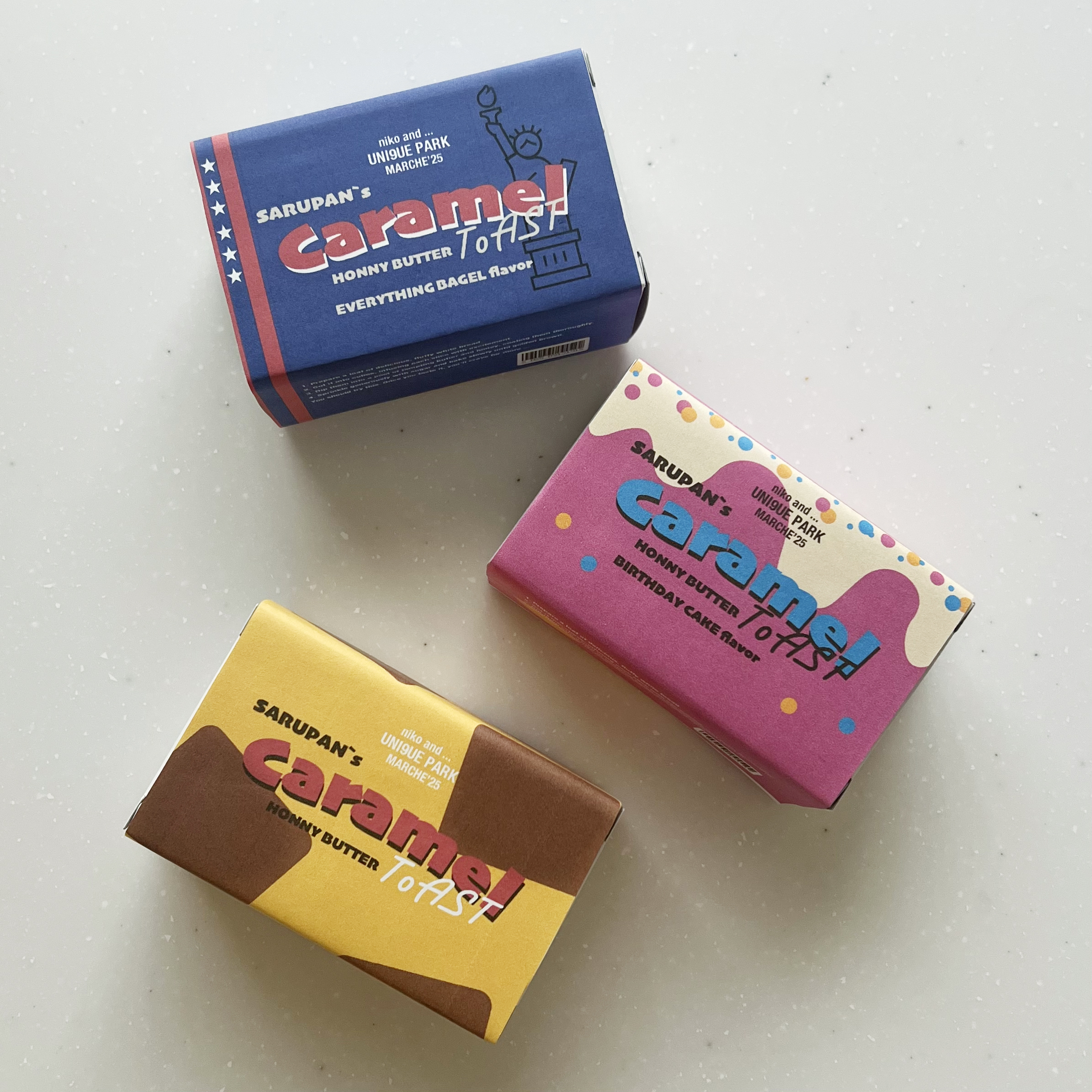 スタンダードなキャラメル味、エブリシングベーグル味、バースディケーキ味の3種類をご用意します!